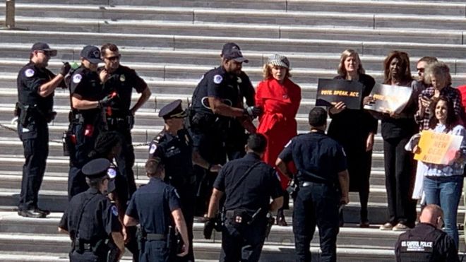 اعتقلت السلطات في العاصمة الأمريكية واشنطن الممثلة المعروفة جين فوندا خلال مشاركتها في مظاهرات تطالب بالحفاظ علي البيئة، وصور ناشطون الممثلة، البالغة من العمر 81 عاما، وهي رهن الاعتقال ويصحبها شرطي إلى سيارة الشرطة أمام مقر الكونغرس.وكانت فوندا قد قالت قبل ذلك إنها ستشارك في المظاهرات التي تنظمها مجموعة “تغيير النفط الدولية” والتي وصفتها بأنها “مجموعة رائعة أنشأها شبابنا”.الممثلة الكبيرة واحدة من 16 شخصا اعتقلوا خلال هذه المظاهرات في واشنطن، وقالت محطة سي بي إس الأمريكية إن جميع المعتقلين وجهت لهم اتهامات بإعاقة الطريق والتجمهر. ومن المعروف أن لها تاريخ طويل من المشاركة في المظاهرات. وقد التقطت لها صور خلال إلقاء خطاب في المتظاهرين ضد التغير المناخي في لوس أنجليس الشهر الماضي.