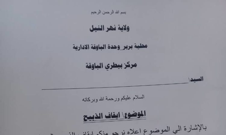 منع المركز البيطري بالباوقة، ببربر التابعة لولاية نهر النيل زبيح الحيوانات في المسالخ بغرض بيعها للمواطنين.
