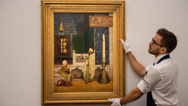 حققت لوحة “درس القرآن” للفنان التركي عثمان حمدي بك مبلغ 4.640.100 جنيه استرليني عند عرضها للبيع في مزادات سوذبيز في لندن، متفوقة على العديد من اللوحات التي رسمها فنانون استشراقيون أوروبيون عرضت للبيع ضمن ما يعرف بمجموعة نجد في المزاد نفسه.