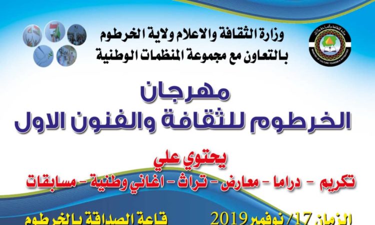 تنطلق بالخرطوم فعاليات مهرجان الخرطوم الاول للثقافة والفنون بقاعة الصداقة بالخرطوم في السابع عشر من نوفمبر الجاري المهرجان الذي يأتي شراكة ما بين وزارة الثقافة والاعلام ولاية الخرطوم ومجموعة المنظمات الوطنية الذي يعتبر انطلاقة حقيقية للفعاليات الثقافية التي تبشر بالسلام وقضايا الراهن الثقافي علي خلفية توجه الدولة في الفترة المقبلة التي وضعت السلان هو المرتكز الاساسي لحلحلة قضايا البلاد وفق خطة شاملة لكل القطاعات بما فيها محور الثقافة والابداع بكل ضروبه.