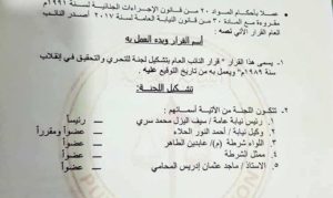 وطبقًا للقرار، تتكون اللجنة من رئيس نيابة عامة سيف اليزل محمد رئيساً، وكيل نيابة أحمد الهور عضواً ومقررًا، اللواء شرطة (م) عابدين الطاهر عضواً، ممثل للشرطة عضواً، ماجد عثمان إدريس المحامي عضواً.