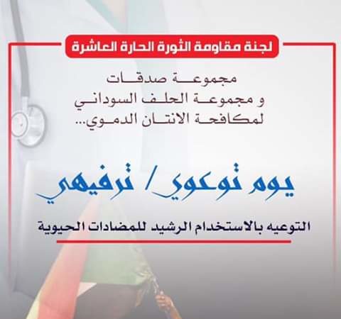 وجهت لجنة مقاومة الثورة الحارة العاشرة بولاية الخرطوم دعوة لجميع الثائرين على معاقل الظلم والفساد والاستبداد للمشاركة في فعالية “الإسبوع العالمي للتوعية بالمضادات الحيوية”، بالتعاون مع منظمة الصحة العالمية ومجموعة الحلف السوداني لمكافحة الانتان الدموي ومنظمة صدقات، يوم الاحد المقبل بميدان الاولمبية “غرب محطة المهدواي” من التاسعة صباحا وحتى الخامسة مساءاً.
