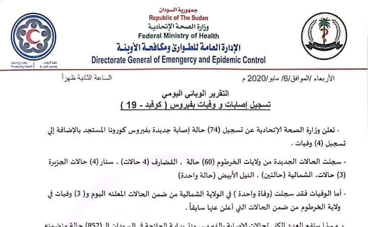 أعلنت وزارة الصحة السودانية في تقريرها اليومي عن جائحة الكورونا تسجيل عدد (74) حالة اصابة جديدة بفايروس كرونا المستجد متضمنة عدد (4) وفيات وعدد (10) حالة شفاء .. ليبلغ اجمالى الحالات المسجلة حتى اليوم (852) حالة متضمنة (49) حالات وفاة وعدد (80) حالة شفاء.