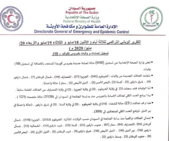 أعلنت وزارة الصحة الإتحادية؛ عن تسجيل 410 حالة اصابة جديدة بكورونا و10 وفيات وذلك عن أيام الاثنين، الثلاثاء والأربعاء؛ ليرتفع العدد الكلي المسجل للاصابات الى 3138 متضمنة 121حالة وفاة.وبحسب تقرير الوزارة؛ إن الحالات سجلت في ولاية الخرطوم 345 حالة؛ و27 بالجزيرة، 10 بالقضارف و6 نهر النيل؛ و 7 في شمال كردفان، 4 شمال دارفور، 3 شرق دارفور، 3 كسلا، 2 البحر الأحمر، 2 النيل الأبيض وحالة واحدة في سنار.