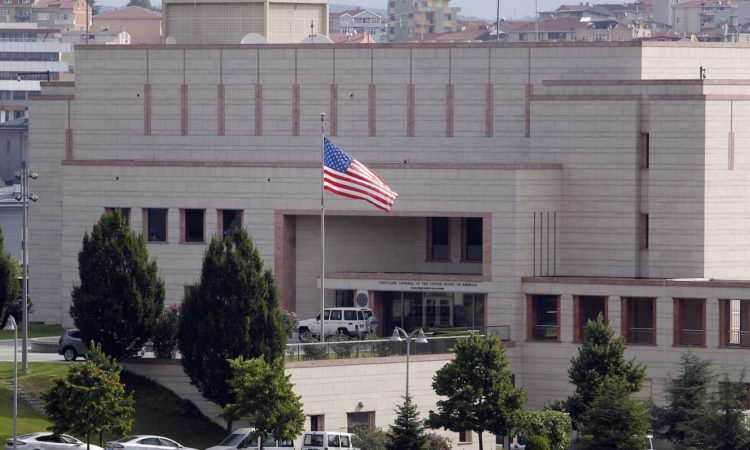 A view of the United States consulate building in Istanbul, Monday, Aug. 10, 2015. Two assailants opened fire at the building in Istanbul on Monday, touching off a gunfight with police, Turkish media reports said. The assailants fled the scene and no one was hurt in the attack.(AP Photo/Lefteris Pitarakis)