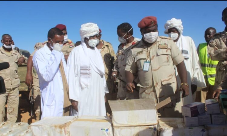 وقال خلال مخاطبته فعاليات استقبال وتسليم القافلة الصحية للمدير الطبي لمستشفى الزرق بحضور قائد قوات الدعم السريع قطاع الزٌرق والإدارة الأهلية إن القافلة الصحية لولايات دارفور تأتي بتوجيه من النائب الأول لرئيس مجلس السيادة الانتقالي ، قائد قوات الدعم السريع الفريق أول /محمد حمدان دقلو ضمن جهود الدولة للحد من جائحة كورونا ، مبيناً ان القافلة تحتوي على معينات طبية ومعقمات وكمامات ومنظفات وأدوات لإصحاح البيئة إضافة الى تنفيذ حملات تعقيم وتطهير ورش للمرافق العامة في المنطقة .