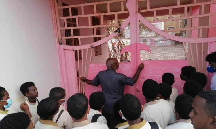 تبادل رواد مواقع التواصل الاجتماعي صوراً مؤثرة لمعلم سوداني يقوم بمراجعة دروس لتلاميذه المتحنيين لشهادة الأساس بالعاصمة السودانية الخرطوم، متخذاً البوابة الخارجية للمدرسة «سبورة» عقب اغلاقها من قبل السلطات الحكومية لتبعيتها لمنظمة محلولة.