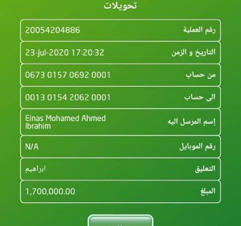 و كتب “ابراهيم عثمان” السلام عليكم ورحمة الله، نزلنا عن طريق الخطأ مبلغ وقدره 1700000جنيه في حساب بإسم إيناس محمد احمد ابراهيم، ولم نتمكن من الوصول إليها نرجو منها او من يتوصل إليها التواصل معنا، « واضعاً أرقام هواتفه وصورة إشعار التحويل».
