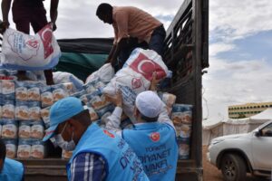 تقوم المنظمة التركية في السودان بحملة كبيرة لمساعدة المتضررين من الفياضانات التي أصابت السوادن هذه السنة؛ ومن ضمنها قام وقف الديانة التركي اليوم في منطقة كلاكلة وأم درمان -مع مشاركة سعادة السفير التركي لدى السودان د. عرفان نذير أغلو- بتقديم أشد ما يحتاج إليه المتضروون من الناموسيات والبطانيات، والمواد الغذائية إلى أربعمائة أسرة، وسوف ينتقل الوفد من الوقف يوم الأحد إلى مدينة مروي لمساعدة 700 أسرة متضررة بالإضافة إلى ما يوزّع إلى الأسر المتضررة في شرق النيل وبحري حيث يبلغ عدد الأسر المستفيدة إلى 1300 أسرة.