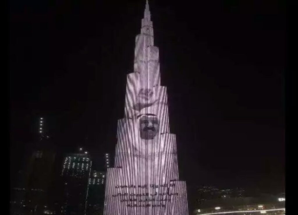 شاهد بالفيديو .. اضاءة برج خليفة بصور امير الكويت الراحل الشيخ صباح
