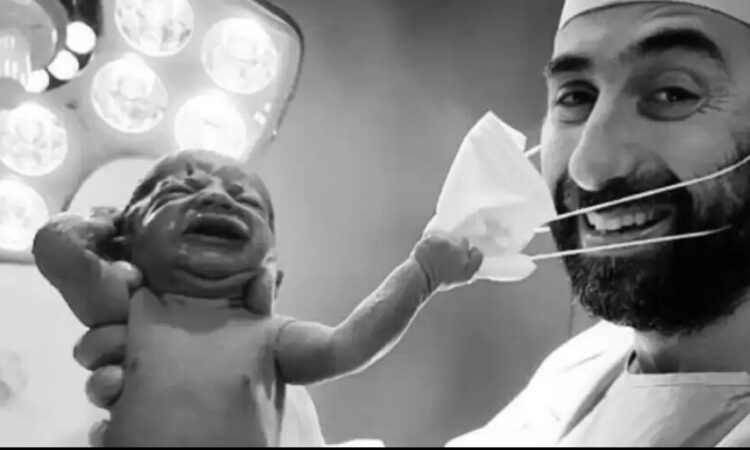 ضجت مواقع التواصل الإجتماعي بصورة مؤثرة لرضيع حديث الولادة، وهو ينتزع بعفوية الكمامة عن وجه الطبيب، في احد مستشفيات دبي، وكأنه يعترض على الكمامة التي فرضها فيروس كورونا.