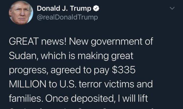 واخيرا غرد الرئيس الأمريكي دونالد ترامب ،اغلى تغريدة في تاريخ تويتر والعالم ،اغلى ثمن يدفعه شعب لجرم لم يرتكبه….دفع الشعب السوداني عبر حكومته أكثر من ثلاثمائة مليون دولار عدا ونقد ،ودفع براميل من الدموع وانهارا من ماء الوجه من أجل جرم لم يكن اصلا من الاساس ،ويعيش الشعب السوداني ذليلا بقية اجياله بسبب تنطع حكومته السابقة وتسرع حكومته الحالية