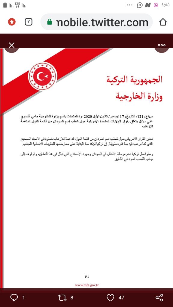 الخارجية التركية تشيد برفع السودان من قائمة الإرهاب