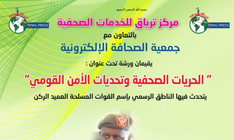 يستضيف منبر وكالة السودان للأنباء في الساعة الواحدة بعد الظهر من يوم بعد غدٍ السبت ورشة عمل تحت عنوان ( الحريات الصحفية وتحديات الأمن القومي)، التي ينظمها مركز ترياق للخدمات الصحفية بالتعاون مع جمعية الصحافة الإلكترونية، بحضور الناطق الرسمي باسم القوات المسلحة العميد ركن عامر محمد الحسن.