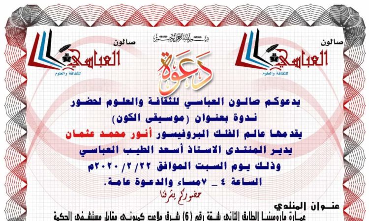 يدعوكم صالون العباسي لحضور فعاليته الأسبوعية المقامة يوم السبت الموافق ٢٢ فبراير ٢٠٢٠م بمقر الصالون بعمارة مارومينا الطابق الثاني شقة “٦” شرق كمبوني .