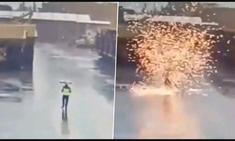 ويوثق الفيديو الذي نشره موقع «نيوز ديتك»، وتم تداوله على نطاق واسع، كيف كان الرجل يمشي حاملا مظلته، ثم وبشكل مفاجيء وقع مايشبه الإنفجار ليسقط الرجل ارضا بينما يسرع عدد من العمال نحوه في محاولة لانقاذه.