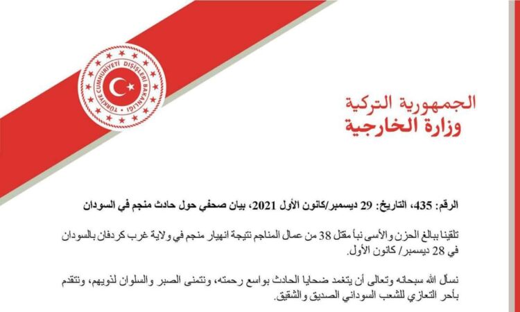 تلقينا ببالغ الحزن والأسى نبأ مقتل 38 من عمال المناجم نتيجة انهيار منجم في ولاية غرب كردفان بالسودان في 28 ديسمبر/ كانون الأول.
