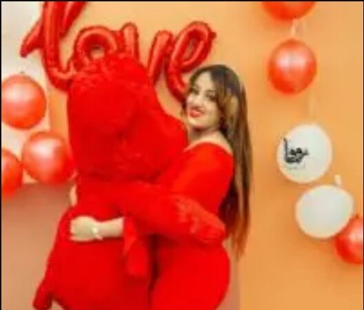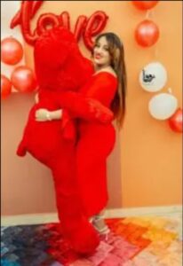 و احتضنت أية دمية “دبدوب” كبير الحجم باللون الأحمر أيضاً.