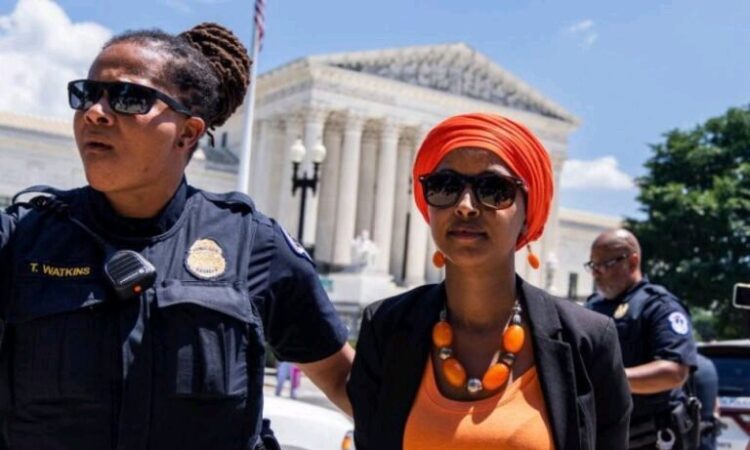 وثق مقطع فيديو لحظة القبض على النائبة الأمريكية إلهان عمر من أمام المحكمة العليا في واشنطن أثناء احتجاجها مع عدد من الديموقراطيين على منع قانون السماح بالإجهاض.
