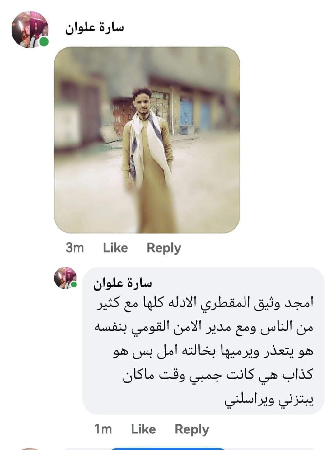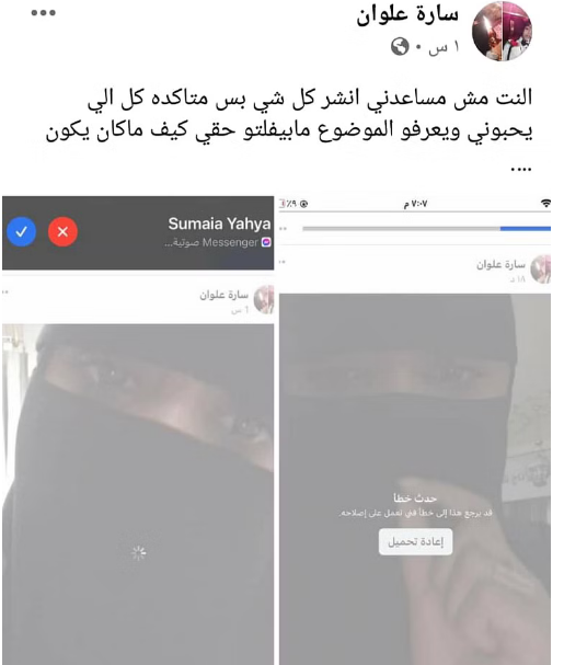 وكتبت سارة علوان، الناشطة المجتمعية، عدة منشورات عبر صفحتها الشخصية على فيسبوك، كشفت من خلالها “تعرضها للابتزاز من قبل شاب وفتاة، وعلى الرغم من أنها قدمت ضدهما عدة بلاغات للأجهزة الأمنية، إلا أنها لم تتلق أي تجاوب أو تفاعل من جانب القيادات الأمنية”.