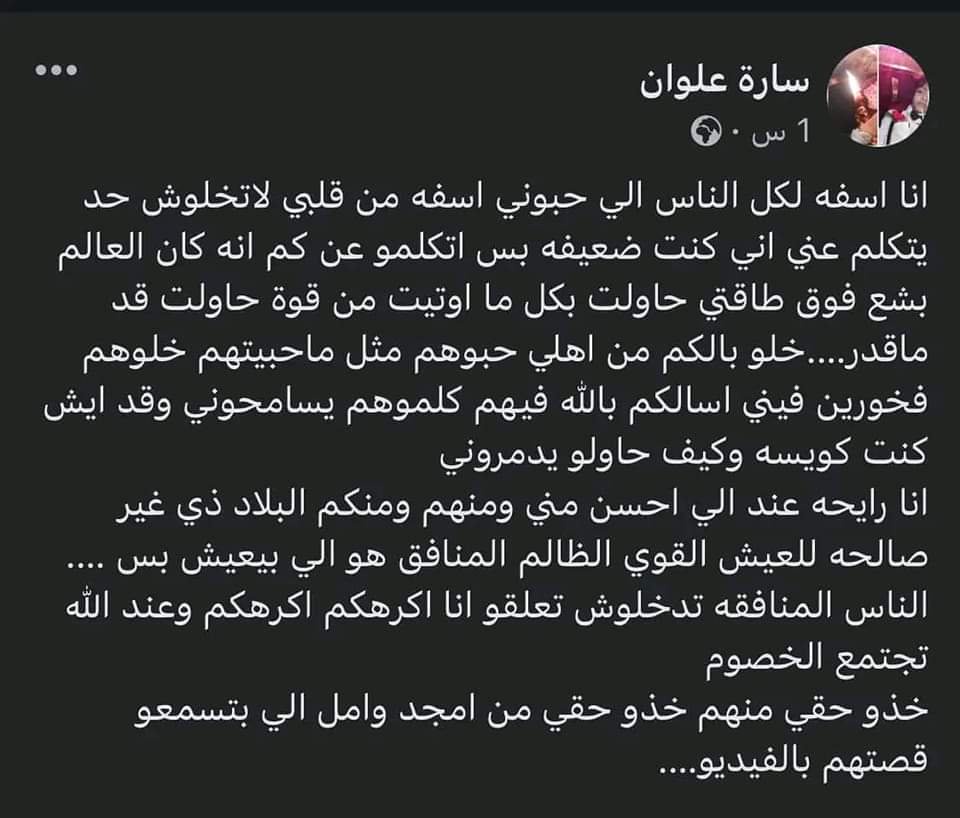وألحقت سارة علوان منشورها السابق بآخر قالت فيه: “أنا آسفة لكل الناس الذين حبوني، آسفة من قلبي، لا تجعلوا أي أحد يتكلم عني، كنت ضعيفة، بس تحدثوا عن كم كان العالم بشعاً فوق طاقتي، حاولت بكل ما أوتيت من قوة، حاولت قد ما أقدر”.