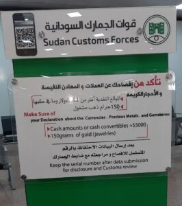 دشن مدير قوات الجمارك السودانية المكلف اللواء معتصم أحمد عثمان نظام الإفصاح الإلكتروني عن العملات الاجنبية للقادمة إلى البلاد حيث تم إنشاء نظام محوسب عبر الصفحة الرسمية للجمارك وعبر كود يتم مسحه بصالة الوصول ليقوم القادم بالافصاح إلكترونيا عن العملات الاجنبية التي يحملها إذا كانت أكثر من خمسة الف دولار