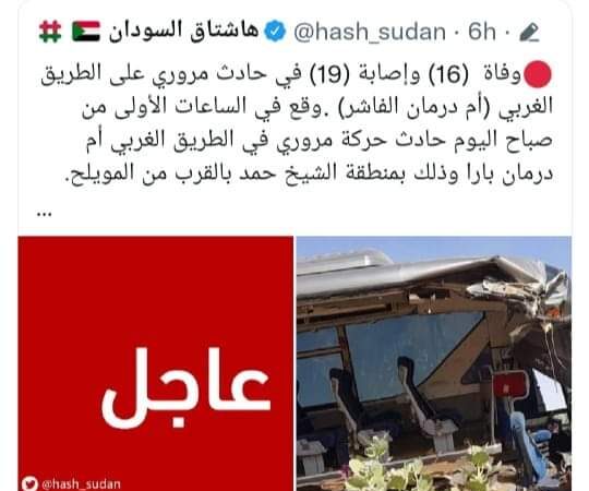 نتقدم باحر التعازي والمواساة في مصرع وإصابة عدد من المواطنين في حادث حركة مروري في الطريق الغربي ام درمان بارا.