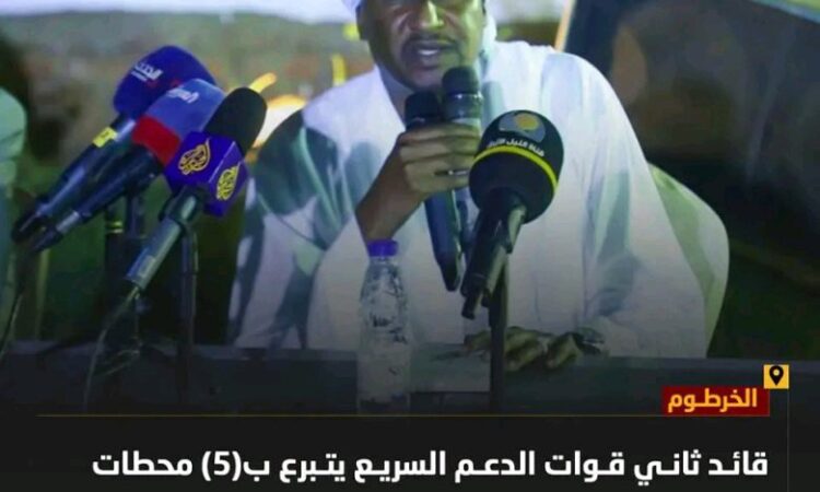 أعلن قائد ثاني قوات الدعم السريع، الفريق عبدالرحيم حمدان دقلو، عن تبرعه ب(5) محطات مياه، في مناطق العودة الطوعية للنازحين واللاجئين بدارفور.