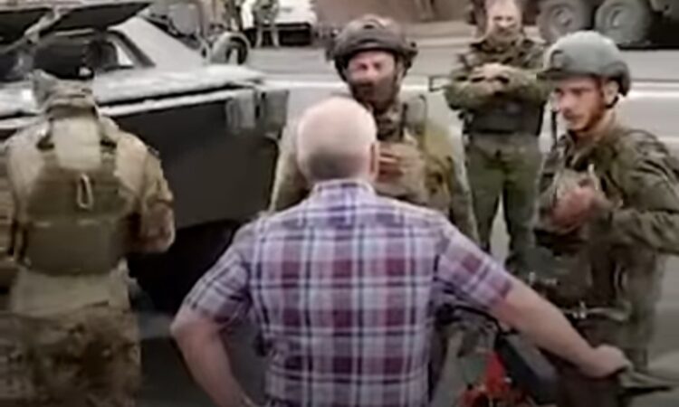 بالفيديو رجل يجادل قوة من مرتزقة فاغنر كانوا يغلقون شارعا والطريف أن بعضهم يرتدي ال(كدمول)