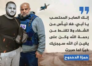 ودع الصحفي الفلسطيني مراسل قناة الجزيرة الفضائية اليوم وائل الدحدوح نجله حمزة الذي استشهد في قصف إسرائيلي استهدف صحفيين غرب خان يونس.