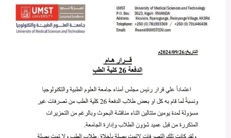 لجأت جامعة العلوم الطبية، إلى خيار إلغاء الامتحانات النهائية للدفعة 26 كلية الطب والتي أقيمت بدولة رواندا. وذلك بسبب شغب ارتكبه طلاب الدفعة، ما دفع السلطات الرواندية إلى اتخاذ قرار بإغلاق الجامعة وطرد كافة طلابها.