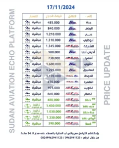 أصدرت سلطة الطيران المدني السوداني صدى الطيران تحديث لأسعار تذاكر الطيران وحجوزات الطيران لمختلف الوجهات الدولية.