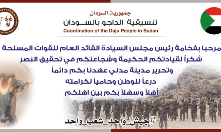 في مشهد مهيب تنسيقية الداجو بالسودان تستقبل السيد رئيس مجلس السيادة القائد العام للقوات المسلحة السودانية فخامة الفريق أول ركن عبد الفتاح البرهان وتتعهد بالوقوف خلف القائد وقال نائب الأمين العام للتنسيقية دكتور سعد الله محمد احمد ان امة الداجو تقف خلف القوات المسلحة والقوات المساندة لها وتعرب التنسيقية عن جاهزيتها لتحرير دارفور وكل بقاع السودان فكل أجزائه لنا وطن.
