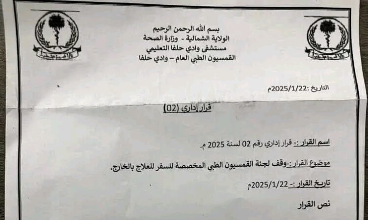 قررت لجنة القمسيون الطبي المخصصة للسفر للعلاج بالخارج بمستشفى وادي حلفا، إيقاف عملها اعتبارا من اليوم الأربعاء.