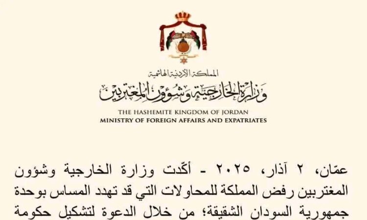 وأكدت وزارة الخارجية وشؤون المغتربين الأردنية، في بيان اليوم الأحد، رفض المملكة للمحاولات التي قد تهدد المساس بوحدة جمهورية السودان، من خلال الدعوة لتشكيل حكومة سودانية موازية، مما يعيق جهود التوصل لحل للأزمة السودانية.