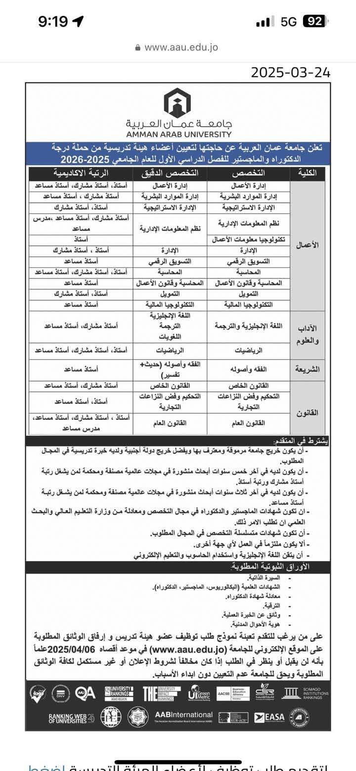 تعلن جامعة عمان العربية عن حاجتها لتعيين أعضاء هيئة تدريس من حملة درجة الدكتوراه و الماجستير للفصل الدراسي الأول للعام الجامعي 2026/2025