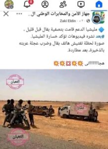 انتشرت على مواقع التواصل الاجتماعي صورة تظهر الناشط المتمرد مع مليشيا الجنجويد المدعو ابراهيم بقال وهو يتعرض للتفتيش الشخصي وتفتيش هاتفه النقال وذلك بعد نشره فيديوهات يتحدث فيها عن الخذلان والهزيمة ما تم اعتباره تخذيلا لقوات المليشيا