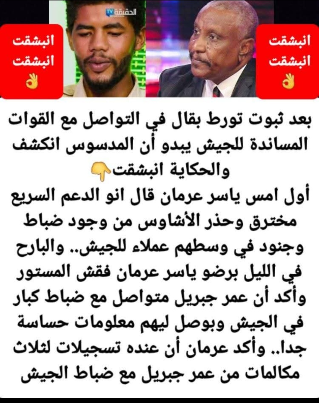 في تسارع مخيف للأحداث وتوضيح للانهيار الذي أصاب المليشيا مؤخرا كشف القيادي بالحركة الشعبية شمال ياسر عرمان عن مجموعة من ضباط المليشيا الذين ظلوا يتواصلون مع استخبارات الجيش حيث أكد أن بقال وعمر جبريل ليسوا الا رأس جبل الجليد في هذه المجموعة التي استطاعت في وقت وجيز أن تفكك المليشيا في جميع أنحاء السودان