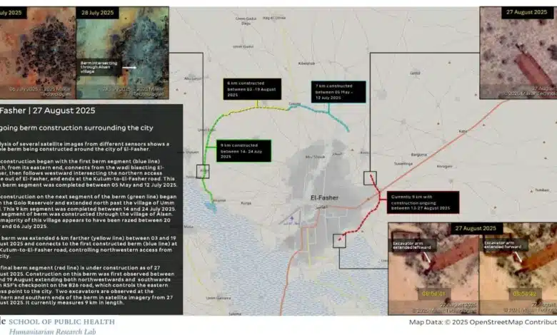 كشف تقرير حديث صادر عن مختبر الأبحاث الإنسانية بجامعة ييل الأميركية، أن قوات الدعم السريع شرعت في إنشاء حواجز ترابية ضخمة تحيط بمدينة الفاشر بولاية شمال دارفور، بطول يتجاوز 31 كيلومتراً، في خطوة وُصفت بأنها جزء من التحركات الميدانية المكثفة التي تشهدها المنطقة.