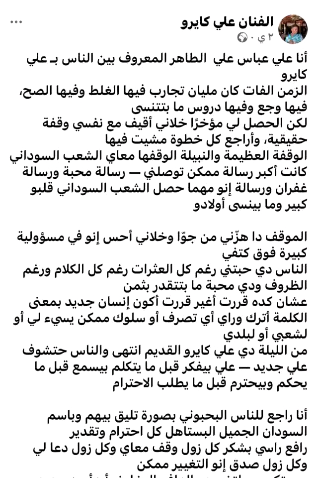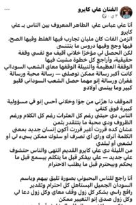نعى الوسط الفني بقلوب يملؤها الحزن والأسى وفاة الفنان علي عباس الشهير بـ علي كايرو الذي توفاه الله إثر مضاعفات عملية جراحية أجريت له في مستشفى سانت فرانسيس بكمبالا.