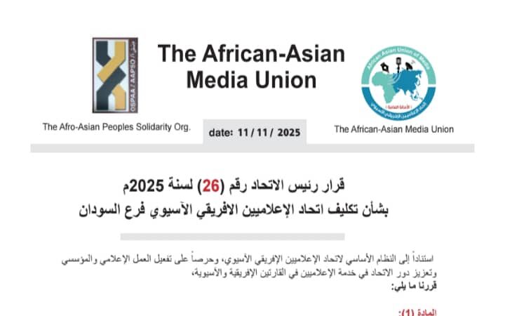 في اطار تعزيز العلاقات الاكاديمية والنقابية بين الصحافيين الافارقة والاسيويين أصدر رئيس إتحاد الإعلاميين الأفريقي الأسيوي الدكتور نزار الخالد القرار رقم (26) لسنة 2025م تم بموجبه تشكيل اتحاد الإعلاميين الافريقي الأسيوي فرع السودان برئاسة عبدالباقي جبارة. البكري ، عمر محمد علي سليمان نائبا للرئيس ،محمد ادم بركة أمينا عاما ، هنادي عبداللطيف نائب الأمين العام ، سعدية الياس الأمين المالي ، أسامة محمد شئون العضوية. ، عبدالعزيز النقر شئون التدريب والمشروعات ، وصال فاروق المرأة والطفل ، أفراح تاج الختم العلاقات الخارجية ، وصلاح باب الله الإعلام والعلاقات العامة .