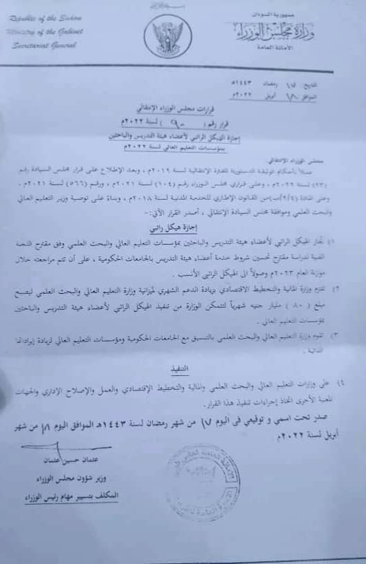 اصدر مجلس الوزراء السوداني قرارا اجاز فيه الهيكل الراتبي الجديد لأعضاء هيئة التدريس والباحثين بمؤسسات التعليم العالي والبحث العلمي لسنة 2022م.