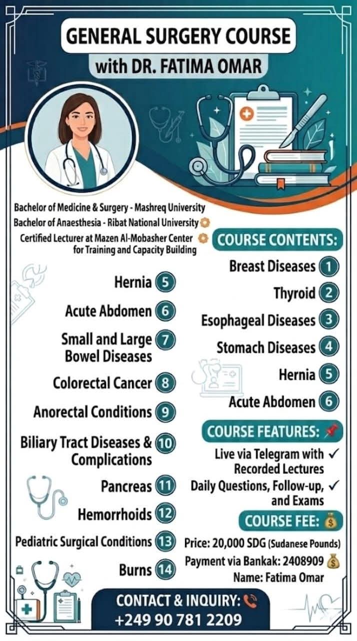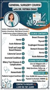 محتوى الدورة: تغطي الدورة مجموعة واسعة من المواضيع الجراحية مثل أمراض الثدي، الغدة الدرقية، أمراض المريء والمعدة، الفتق، جراحات البطن الحادة، أمراض الأمعاء، سرطان القولون والمستقيم، أمراض الشرج، أمراض القنوات المرارية، والبنكرياس.