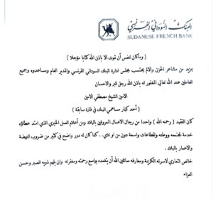 بمزيد من مشاعر الحزن والالم يحتسب مجلس ادارة البنك السوداني الفرنسي والمدير العام ومساعدوه وجميع