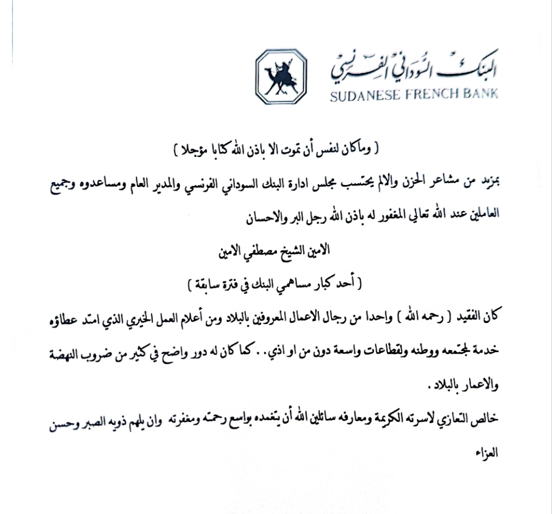 البنك السوداني الفرنسي ينعي فقيد البلاد :,رجل الأعمال :الامين الشيخ مصطفي الامين