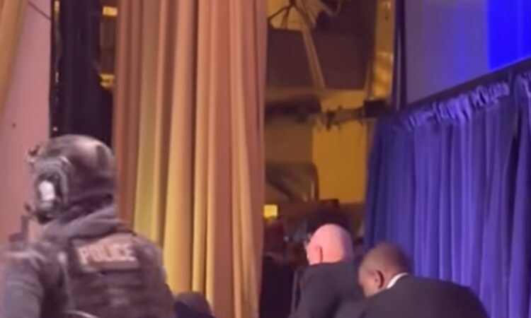 بعد اقتحام المسلح ردهة القاعة التي كان ترامب يجلس فيها إلى المدعويين دلف إلى القاعة الحرس الرئاسي لاجلائه هو ونائبه إلا أن الرئيس تعثر وسقط أرضا ما جعل الحراس يحملونه (على اربعة)