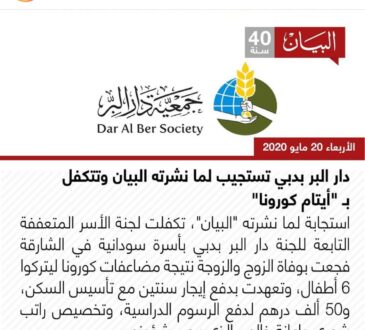 الاخبار«دار البر» بدبي تتكفل بأيتام كورونا السودانيين وتدفع إيجار سنتين و 50 ألف درهم رسوماً دراسية6 سنوات ago235في استجابة عبر موقعها الالكتروني مساء امس تحت عنوان (كورونا تيتم 6 اطفال بوفاة الزوج والزوجة)، حيث فجعت أسرة سودانية...