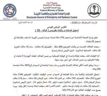الاخبارالصحة:74 إصابة جديدة و10حالات شفاء6 سنوات ago942أعلنت وزارة الصحة السودانية في تقريرها اليومي عن جائحة الكورونا تسجيل عدد (74) حالة اصابة جديدة بفايروس كرونا المستجد متضمنة...