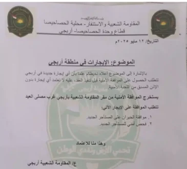 الاخباراعلان مهم من المقاومة الشعبية بمنطقة اربجي ولاية الجزيرة6 أشهر ago71فرضت المقاومة الشعبية بمنطقة اربجي بولاية الجزيرة إجراءات صارمة لايجار المنازل في المنطقة وذلك لضبط حركة التنقل المستمرة والحد من...
